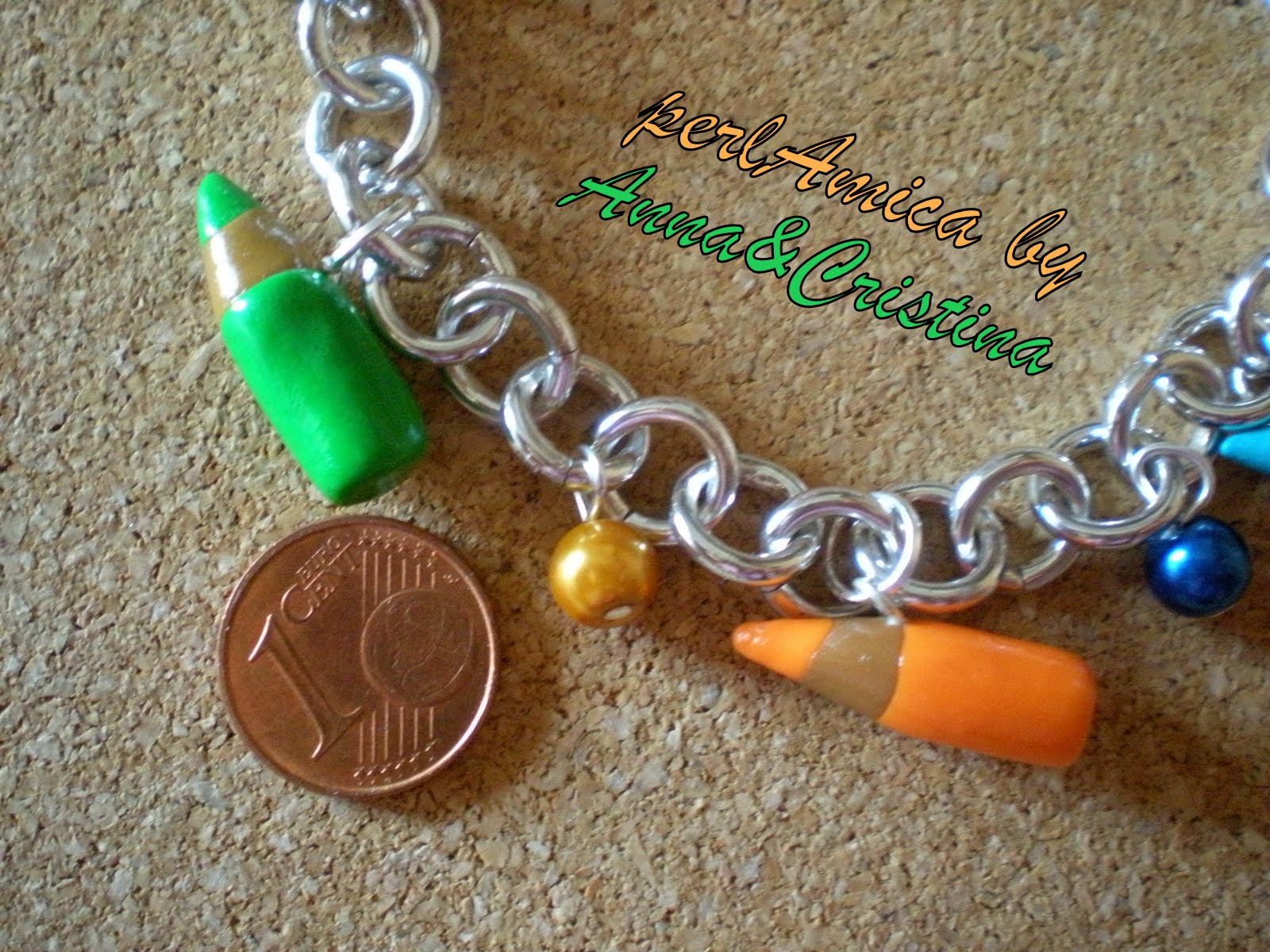 Sul cordino abbiamo inserito tre perle cilindriche e due perle tonde fatte da noi, con le nostre sante ditina e il fimo!!!!